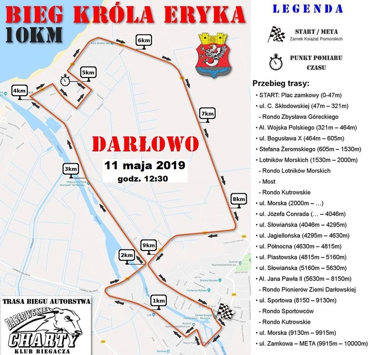 Miasto Darłowo zaprasza na 5. BIEG KRÓLA ERYKA. Bieg główny na dystansie 10 km. Rozpocznie się o godz. 12:30. Trasa: