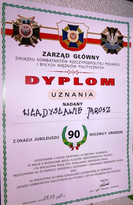 W czwartek 28 marca 2019 w swoim domu w Darłowie Władysława Jarosz obchodziła Jubileusz 90 – tych urodzin. Na tę uroczystość zjechała rodzina daleka i bliska. W imieniu Zarządu Głównego Związku Kombatantów RP i BWP, Zbigniew Stańczak wręczył Władysławie Jarosz Dyplom Uznania o treści: „Z okazji jubileuszu 90 rocznicy urodzin uczestnikowi II wojny światowej za męstwo i ofiarność w walce o wyzwolenie naszej Ojczyzny Rzeczypospolitej Polskiej i za wieloletnią pracę przy powojennej odbudowie kraju, przyczynianie się do rozwoju narodowej gospodarki i umacnianie obronności Polski oraz za wieloletnią aktywną działalność członkowską w szeregach Związku Kombatantów RP i Byłych Więźniów Politycznych”. Podpisał prezes - generał dywizji Wacław Szklarski.
