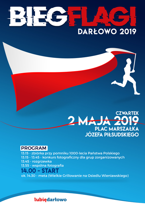 Wszystkich mieszkańców Darłowa oraz naszych gości zapraszamy 2 maja br. (tj. czwartek) do udziału w corocznym biegu biało-czerwonych - czyli do udziału w Biegu Flagi. Spotykamy się o godz. 13:15 na Placu Marszałka Józefa Piłsudskiego w Darłowie (przy ul. Wojska Polskiego). Trasa biegu: Plac Marszałka Józefa Piłsudskiego - Bogusława X - Wyspiańskiego - Wojska Polskiego - Skłodowskiej - Podzamcze - Morska - Wenedów - Franciszkańska - Plac Kościuszki - Powstańców Warszawskich - Tynieckiego - Św. Gertrudy - Wieniawskiego. Meta znajdować się będzie na placu zabaw na Osiedlu Południe gdzie na zakończenie biegu odbędzie się Wielkie Grillowanie. Bieg rozpoczniemy o godzinie 14:00.
