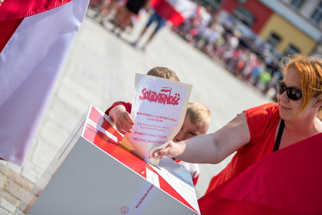 Szczególnie wyróżniającym się elementem dzisiejszego happeningu - będącego „żywą lekcją historii” - były licznie mieniące się w słońcu biało-czerwone flagi. To między innymi dowód utożsamiania z barwami narodowymi najpiękniejszych wartości, o których dziś pamiętaliśmy szczególnie, tj.: wolność, solidarność i demokracja.