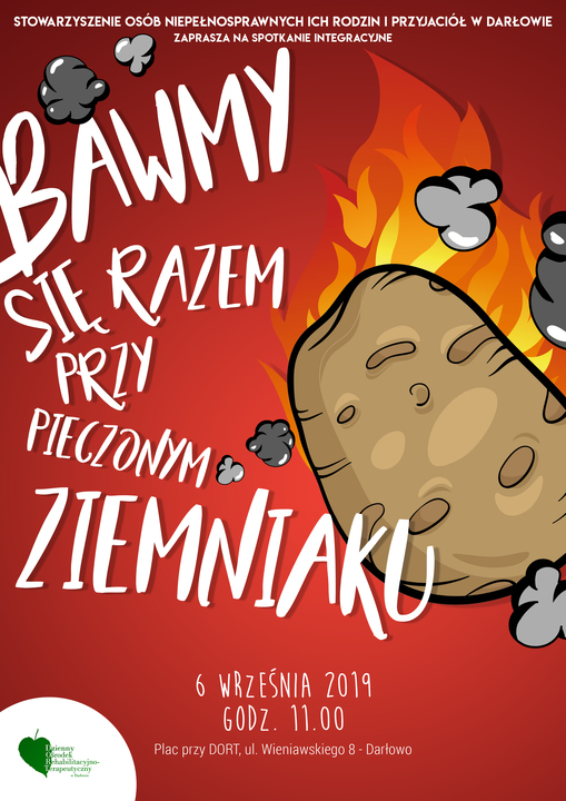 Stowarzyszenie Osób Niepełnosprawnych ich Rodzin i Przyjaciół w Darłowie ma przyjemność zaprosić na spotkanie integracyjne pn.: Bawmy się przy pieczonym ziemniaku, które odbędzie się 6 września 2019 roku w Darłowie. Rozpoczęcie nastąpi o godz. 11:00 na placu przy siedzibie DORT Darłowo - tj. ul. Wieniawskiego 8.
