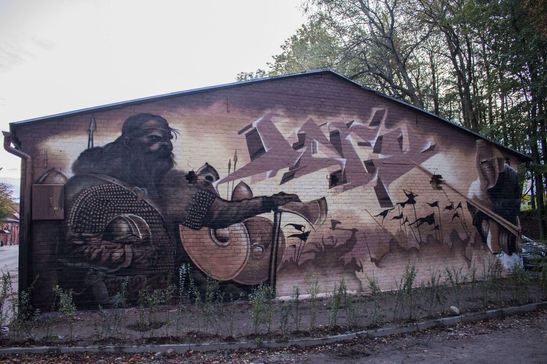 Motywem przewodnim jest postać wikinga oraz rycerza z wkomponowanym napisem przestrzennym w stylu streetart, który jednocześnie jest autografem darłowiaka. - Jak wiadomo Królewskim Miastem zarządzał kiedyś Król Eryk Pomorski, a ten został okrzyknięty mianem ostatniego wikinga Bałtyku. Nasza praca miała być lekkim ukłonem w kierunku naszej bogatej historii. Dlatego zdecydowaliśmy się na taką tematykę. Chociaż sam wiking, którego stworzył Patryk nie jest odzwierciedleniem wizerunku samego Eryka to myślę, że subtelnie oddaliśmy ten klimat. - mówi Jery. - Ciesze się, że moja kolejna praca pojawiła się tym razem w Darłowie. Mam nadzieję, że spodoba się mieszkańcom. Podczas tych dwóch dni, które poświęciliśmy na stworzenie tego muralu wiele osób podchodziło, gratulowało i robiło sobie pamiątkowe zdjęcia. Myślę więc, że nam się to udało - opowiada Paka.