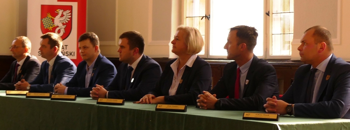 Pierwszym starostą został Henryk Lompert, a siedziba urzędu znajdowała się w budynku „Sławodrzewu”. Następny starosta - Grzegorz Januszewski przeniósł siedzibę starostwa do budynku byłego internatu ZSA i tam funkcjonuje ona do dzisiaj. Kolejnym szefem powiatu został Andrzej Lewandowski. Od grudnia 2010 starostą powiatu sławieńskiego jest Wojciech Wiśniowski. Udział w uroczystej sesji Rady Powiatu wzięli: byli i obecni radni powiatu sławieńskiego, pierwszy starosta powiatu Henryk Lompert, radna Sejmiku Wojewódzkiego Elżbieta Karlińska, starosta sławieński Wojciech Wiśniowski, włodarze miast i gmin Arkadiusz Klimowicz, Radosław Głażewski, Radosław Nowakowski oraz wiele osób związanych z samorządem powiatowym.