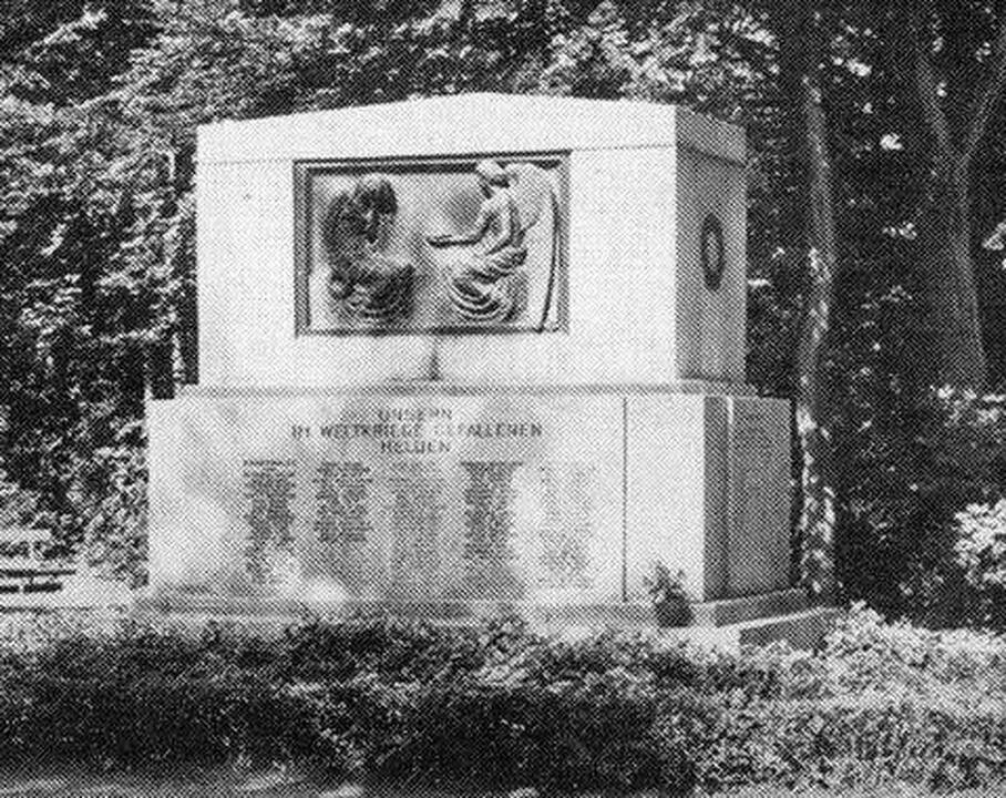 Płyta pochodzi z pomnika wystawionego poległym mieszkańcom Darłowa podczas I wojny światowej. Pomnik upamiętniający żołnierzy poległych w czasie I wojny światowej odsłonięto uroczyście 4 czerwca 1922 r. na wzgórzu Kopa. Wykonano go z granitowych bloków w kształcie tumby spoczywającej na wysokim cokole, na którym w pięciu kolumnach umieszczono nazwiska poległych mieszkańców miasta. Na tumbie znajdował się odlany z brązu relief, przedstawiający młodą niewiastę, przyjmującą z rąk anioła napełnioną czarę. Scena ta była symbolem przerwanego młodego życia ziemskiego i dostąpieniem niebiańskiej szczęśliwości. Po II wojnie światowej pomnik rozebrano, bloki kamienne ustawiono na skraj parku, a płyta z brązu zaginęła. Znaleziony granitowy blok jest jednym z pięciu, na których wyryto nazwiska poległych mieszkańców Darłowa. Po odnowieniu zamontowano go na dziedzińcu zamkowym przy wejściu na wystawę Dirlov- Rügenwalde- Darłowo.