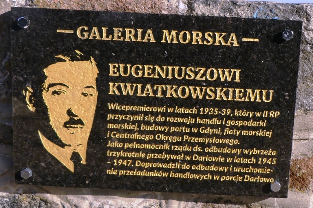 · Eugeniuszowi Kwiatkowskiemu. Wicepremierowi w latach 1935-1939, który w II RP przyczynił się do rozwoju handlu i gospodarki morskiej, budowy Portu w Gdyni, floty morskiej i Centralnego Okręgu Przemysłowego. Jako pełnomocnik Rządu ds. odbudowy wybrzeża trzykrotnie przebywał w Darłowie w latach 1945-1947. Doprowadził do odbudowy i uruchomienia przeładunków handlowych w porcie Darłowo