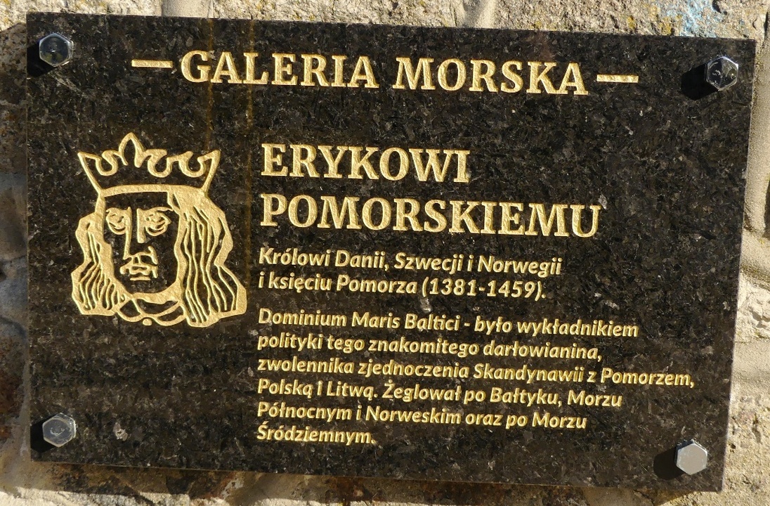 · Erykowi Pomorskiemu – Królowi Danii, Szwecji, Norwegii i księciu Pomorza (1381-1459). Dominium Maris Baltici- było wykładnikiem polityki tego znakomitego darłowianina, zwolennika zjednoczenia Skandynawii z Pomorzem, Polską i Litwą. Żeglował po Bałtyku, Morzu Północnym i Norweskim oraz po Morzu Śródziemnym