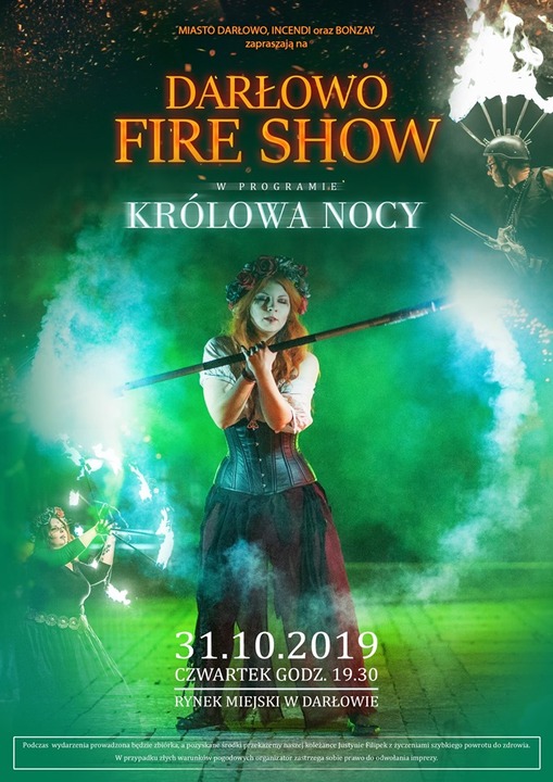 Miasto Darłowo, Incendi oraz Bonzay mają zaszczyt zaprosić Państwa na czwartą edycję pokazu żywego ognia - "Darłowo Fire Show". Tym razem koszalińska grupa artystyczna zaprezentuję nam półgodzinny spektakl specjalnie przygotowany dla darłowskich widzów pt. "Królowa Nocy". To jedyna szansa, aby zobaczyć ten spektakularny teatr ognia, światła i dźwięku. Wydarzenie szczególnie polecamy amatorom fotografii.