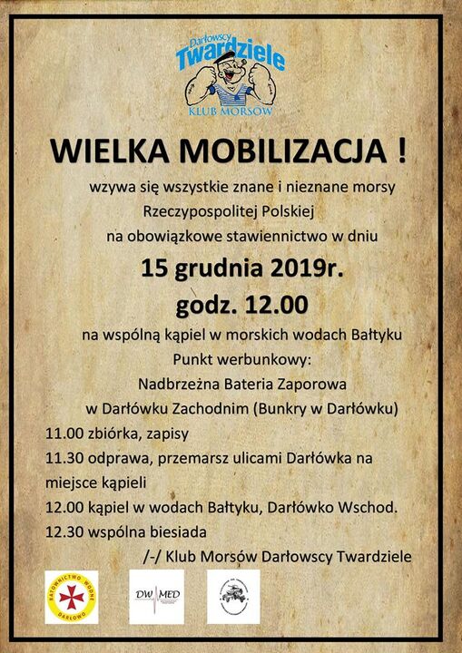 Klub Morsów Darłowskich Twardzieli serdecznie zaprasza Morsową Brać na wspólną kąpiel w zimnych wodach Bałtyku. Kąpiel odbędzie sie dnia 15 grudnia 2019r na Plaży w Darłówku Wschodnim przy hotelu Apollo pod czujnym okiem Ratownictwa Wodnego Darłowo oraz DW-Med Ratownictwo Medyczne.