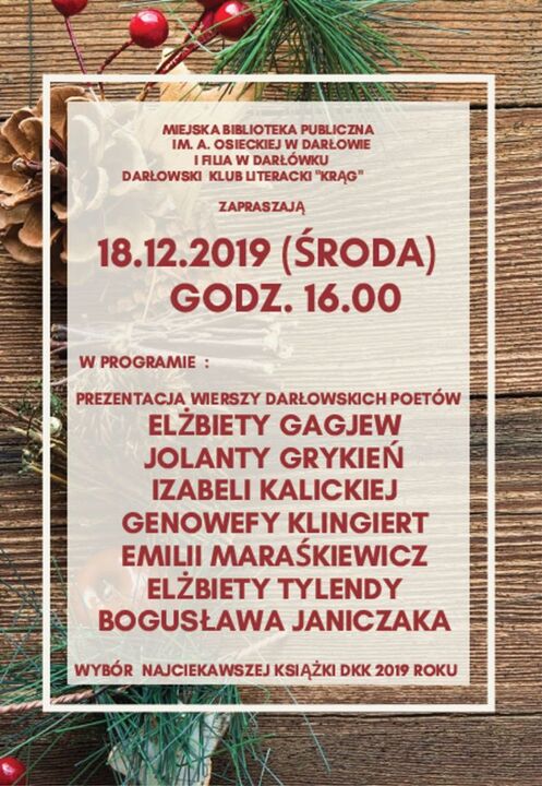 Miejska Biblioteka Publiczna im. Agnieszki Osieckiej w Darłowie i Darłowski Klub Literacki „KRĄG” zapraszają w środę 18 grudnia 2019 na „Prezentację wierszy darłowskich poetów”. Czytane będą wiersze: Elżbiety Gagjew, Jolanty Grykień, Bogusława Janiczaka, Izabeli Kalickiej, Genowefy Klingiert, Emilii Maraśkiewicz, Elżbiety Tylendy. Prezentacja odbędzie się w siedzibie MBP przy ul. H. Wieniawskiego 19, początek o godzinie 16. Ponadto organizatorzy dokonają wyboru „Najciekawszej Książki Roku 2019”.