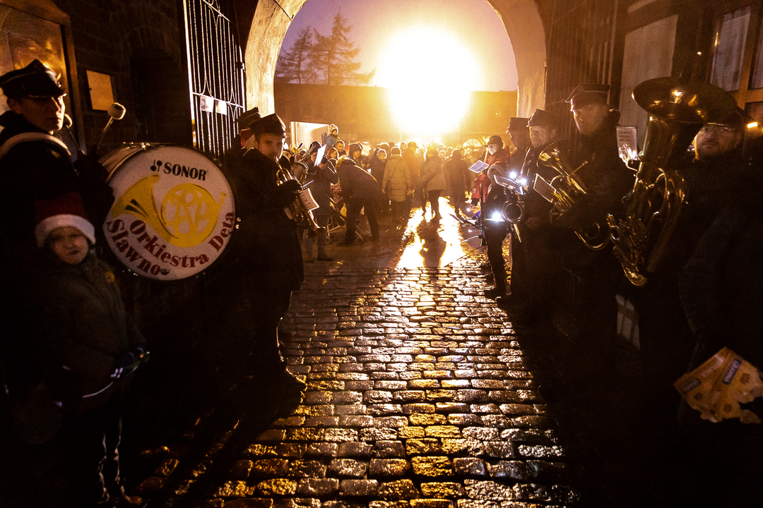 Na dziedzińcu zamkowym po okolicznościowym przemówieniu burmistrza Darłowa Arkadiusza Klimowicza sformułowano kolorowy orszak, kóremu przewodziła Sławieńska Orkiestra Dęta - na czele z dobrymi aniołami Darłowskiego Centrum Wolontariatu: Magdaleną Burduk, Justyną Tepurską i Joanną Witkowską.