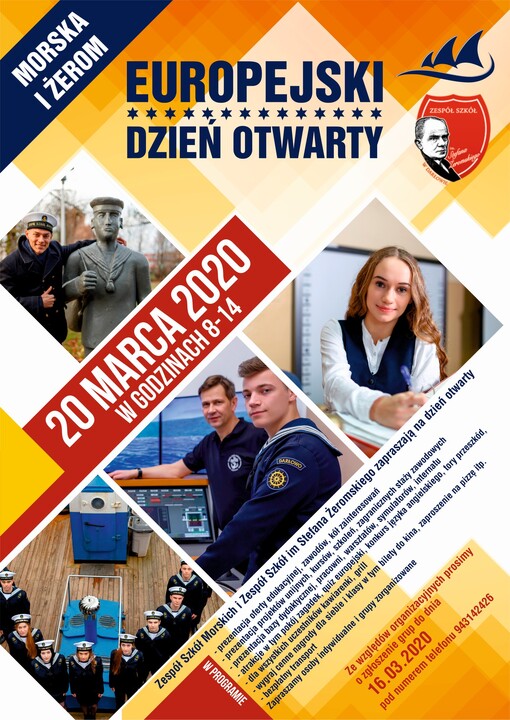 20 marca zapraszamy uczniów klas 8 na Dzień Otwarty w tym roku pod hasłem "Europejski Dzień Otwarty". W związku z realizacją w szkole wielu projektów unijnych chcielibyśmy przedstawić młodzieży możliwości jakie daje korzystanie z funduszy programu Erasmus +. W tym roku zapraszamy wspólnie z Zespołem Szkół im. Stefana Żeromskiego, który od 1 września stanie się częścią naszej szkoły. W tym dniu uczniowie szkół podstawowych będą mieli możliwość zapoznania się z bazą dydaktyczną szkoły, ofertą edukacyjną. Dla uczestników przygotowaliśmy wiele atrakcji w tym grę terenową, warsztaty udzielania pierwszej pomocy, zajęcia strzeleckie. Młodzież będzie miała możliwość spotkania z absolwentami i przedstawicielami pracodawców. Oczywiście nie zabraknie pysznego poczęstunku.